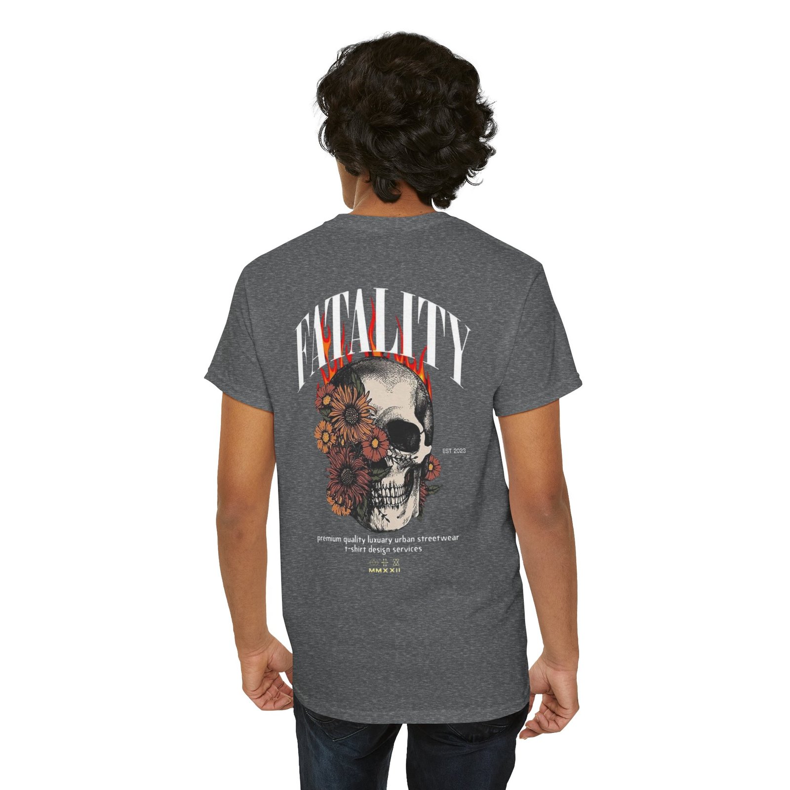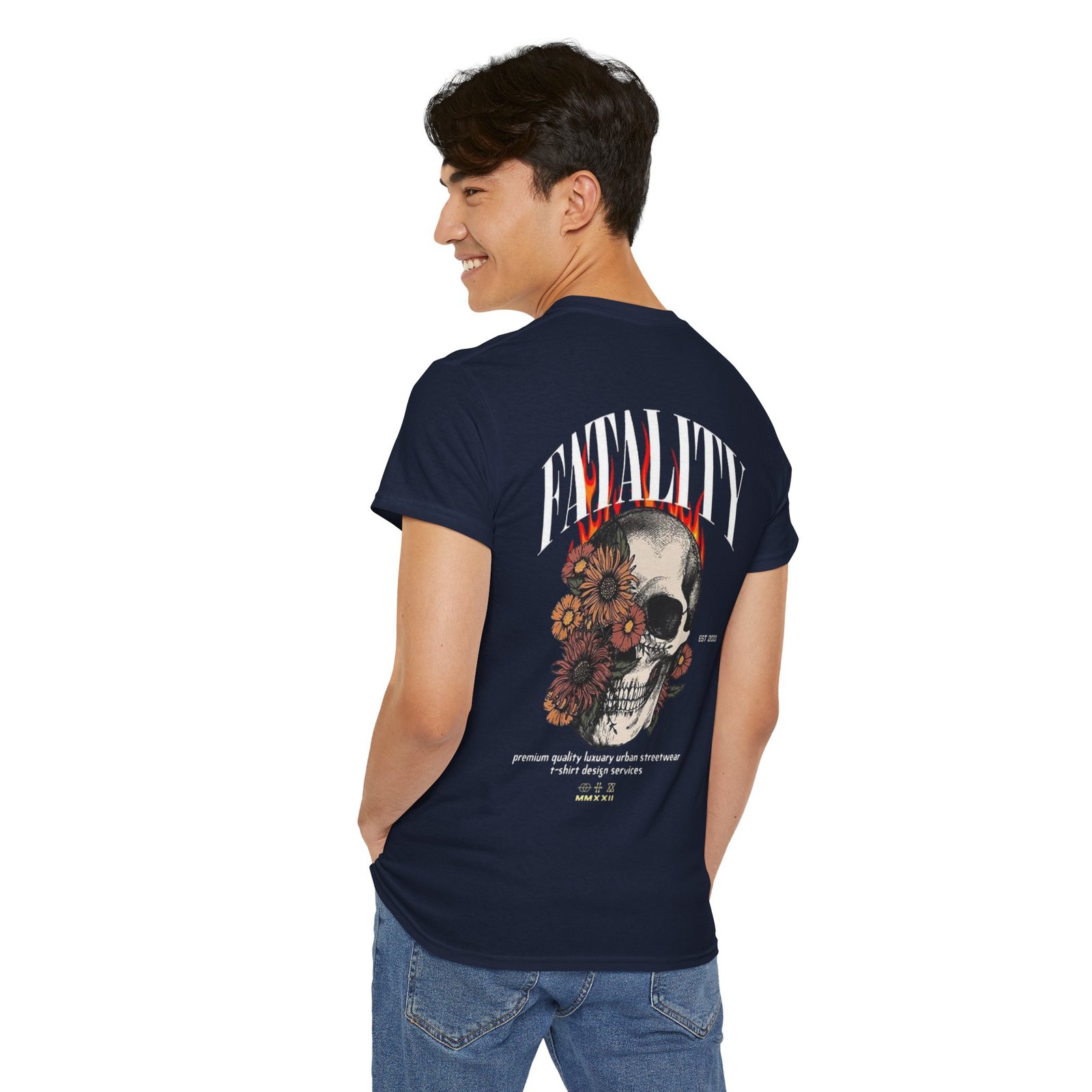 Stand out with this bold Fatality Skull Graphic T-Shirt, designed for lovers of edgy streetwear and urban fashion. The back features a striking skull design adorned with detailed flowers and fiery accents, paired with bold “FATALITY” typography for a powerful statement look.