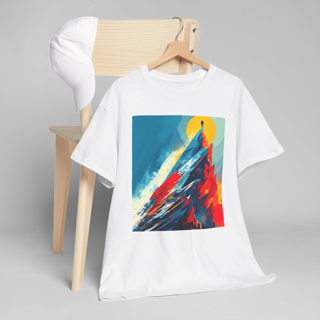 Step into the wild with our Ultimate Mountain Adventure T-Shirt, designed for those who thrive on the thrill of reaching new heights. This graphic T-shirt showcases a powerful abstract illustration of a lone climber reaching the mountain peak, set against a dynamic and vibrant color palette that captures the essence of adventure. Whether you’re a hiking enthusiast, a nature lover, or simply appreciate bold, artistic designs, this T-shirt brings a sense of adventure to your everyday wardrobe.